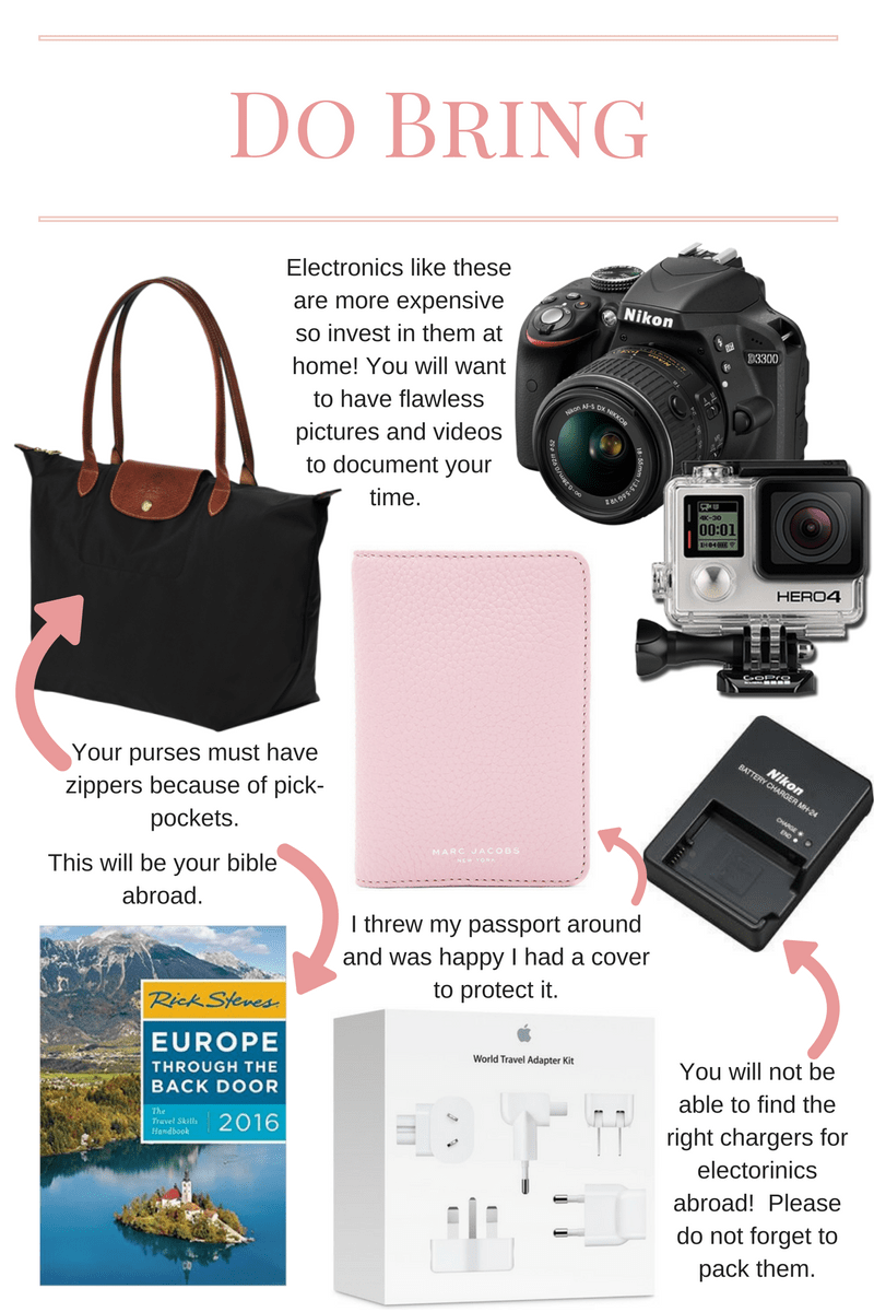 There are lots of things that you will be able to buy once you get there. Things to definitely not bring; full sized shampoo and conditioner, toothpaste, deodorant, every cute shirt you own (you will buy ALOT of clothes there), too many pairs of shoes, and umbrellas.